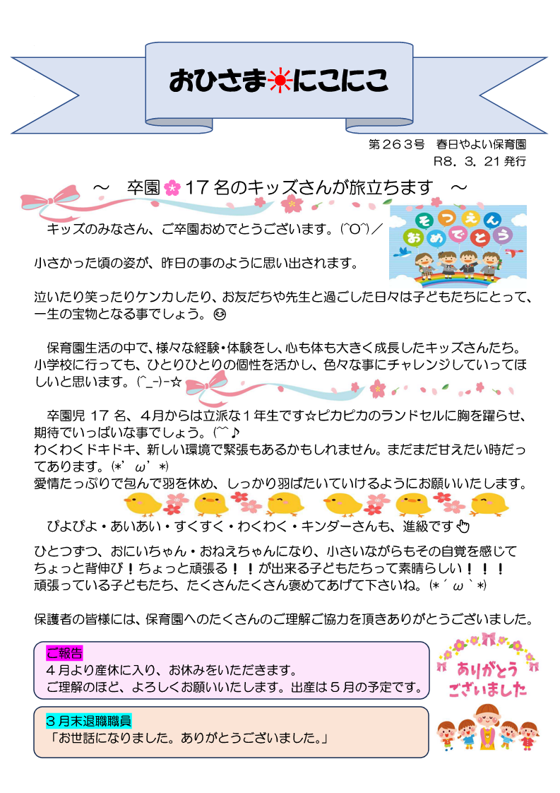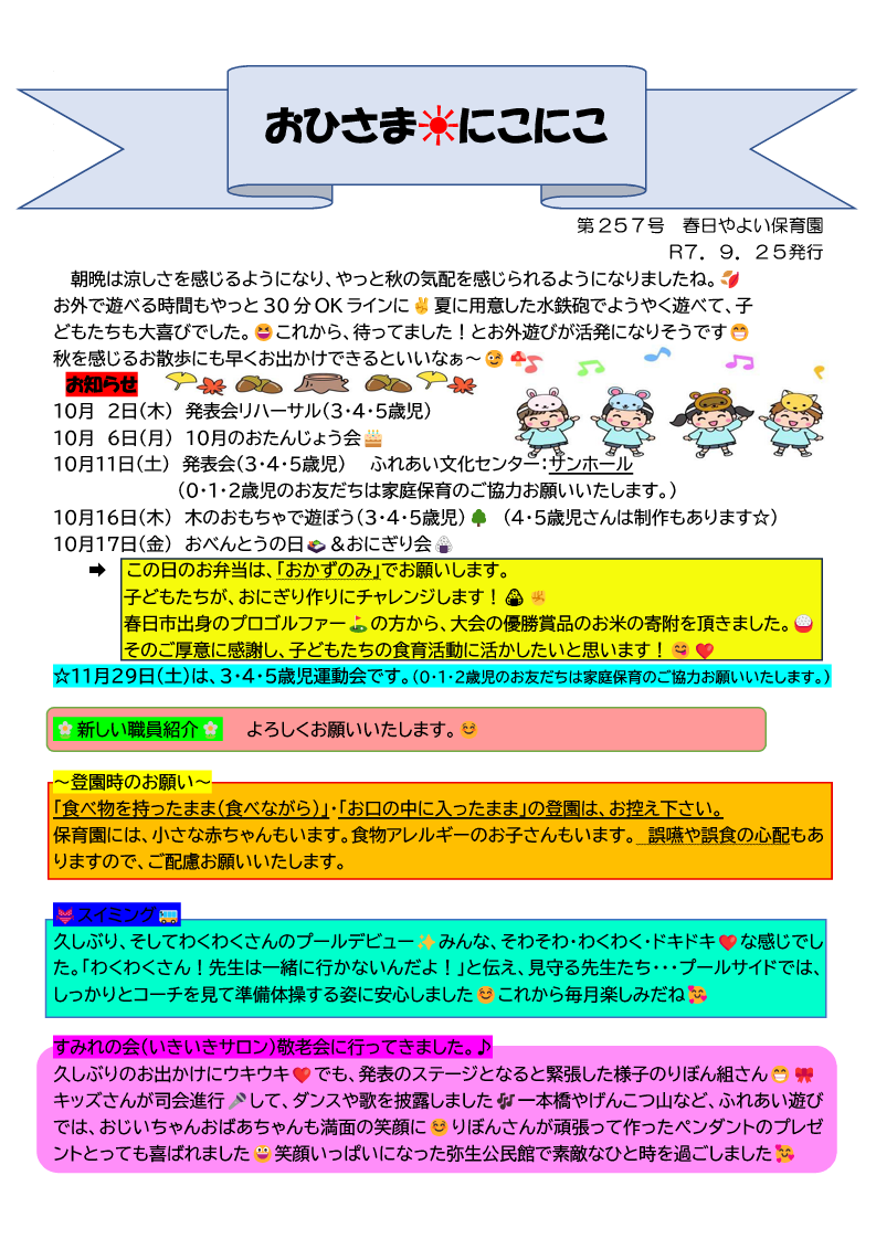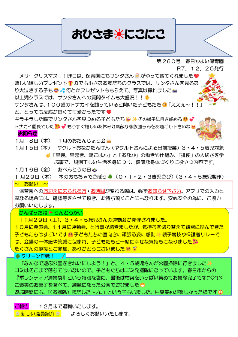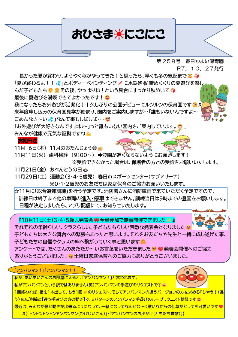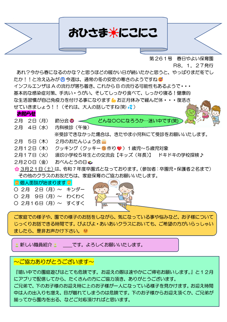 春日やよい保育園では、定期的に保育園通信を発行しています。